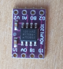 In a second version of the DDS-VFO I added three ADuM1201 boards to isolate the VFO from the RPi. Like optocouplers the ADuM chips isolate input and output. The ADuM1201 is symmetrically and offers one input and one output per side. The ic can also do 3.3V to 5V conversion.